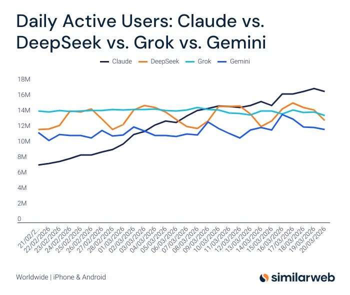 In a major shake-up of the AI leaderboard, Anthropic’s Claude has officially surged past DeepSeek, Grok, and Gemini in daily active users (DAU) on mobile devices for the first time.