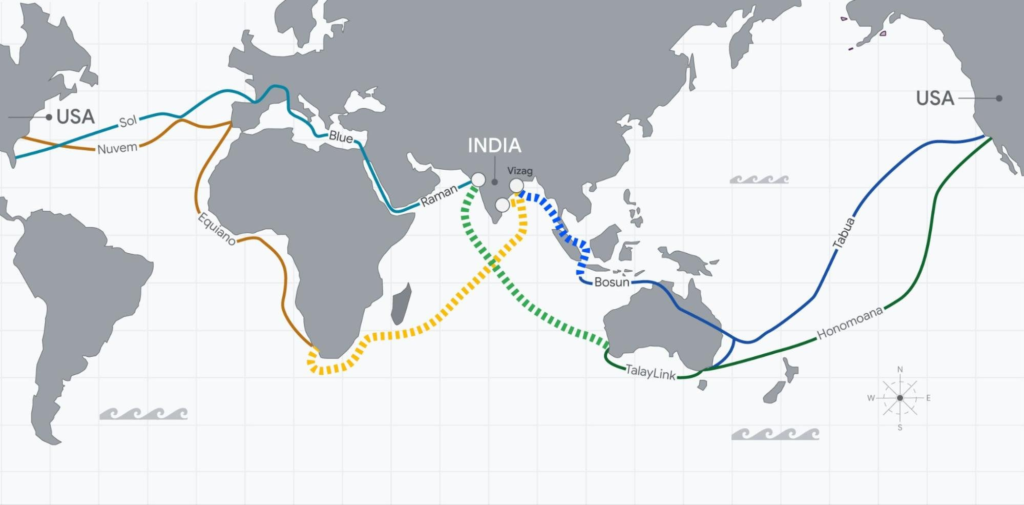 | Vizag โ South Africa | US East Coast | Connects to Google’s Equiano and Nuvem cables to link India directly to the American east coast. |