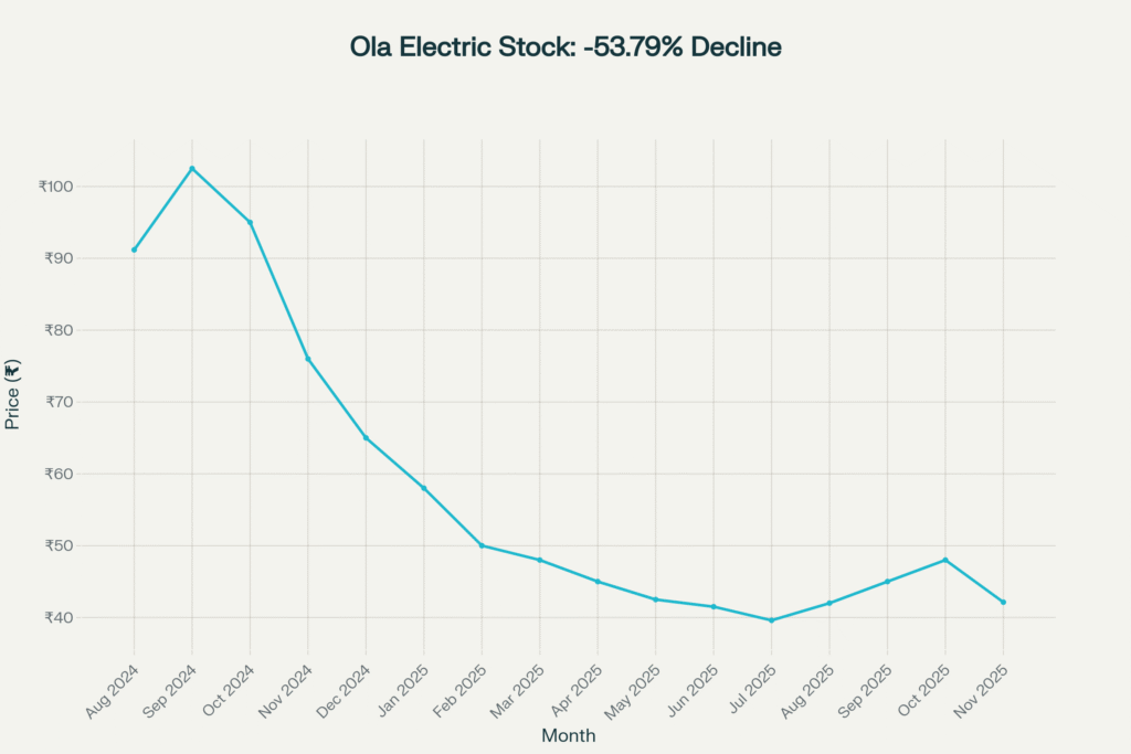 What followed was a stunning market reckoning. By November 2025, Ola Electric was trading at ₹42.13—a devastating 53.79% decline from the listing price in just over one year. The stock hit its 52-week high of ₹102.50 in September 2024 but has since plummeted, with a 52-week low of ₹39.60 in July 2025. The market’s verdict was clear: investors realized that the promises made during the IPO and in pre-launch marketing were not being met. The estimated CAGR is approximately -36.94% based on the issue price and current market price.