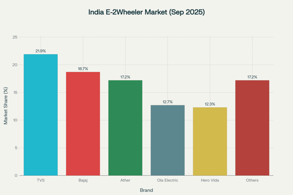 The IPO period coincided with a massive loss of market dominance for Ola Electric. In 2024, Ola had commanded 35% of the electric two-wheeler market. By September 2025, this had shrunk to just 12.7%, placing it fourth in the market behind TVS (21.9%), Bajaj (18.7%), and Ather (17.2%). This was a catastrophic decline for a company that had once been the undisputed market leader.